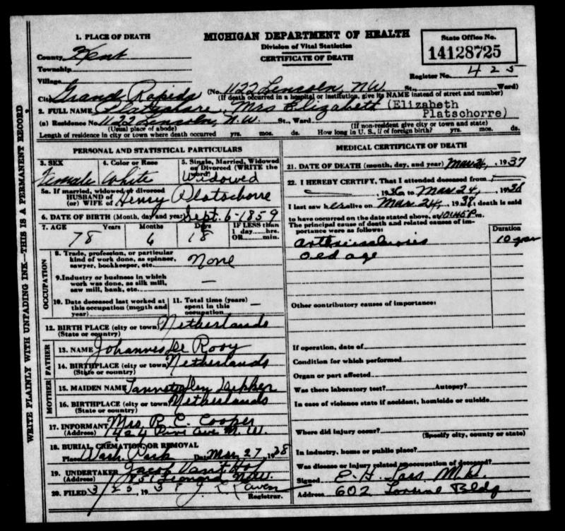 1.11. Elizabeth Platschorre, geboren op 8 januari 1901 in Grand Rapids, Michigan, USA. Elizabeth is overleden op 12 februari 1992 in Grand Rapids, Michigan, USA, 91 jaar oud.