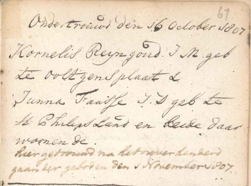 1CornelisReijngoudtisgeborenop12november1743inSt.Philipsland,zoonvanMarinusPieterszReijngoudtenJannetjeWale.Hijisgedooptop24november1743inSt.Philipsland.Cornelis isoverledenop25juni1803inSt.Philipsland,59jaaroud.Cornelistrouwde,25jaaroud,injuni1769inSt.PhilipslandmetNeeltjedenBraber,25jaaroud,nadatzijop9april1738inSt. Philipslandinondertrouwzijngegaan.Neeltjeisgeborenop8december1743inSt.Philipsland,dochtervanVincentdenBraberenNeeltjeBoogaard.Neeltjeisoverledenop10juni1807inSt. Philipsland, 63 jaar oud. Kinderen van Cornelis en Neeltje:1.1.JannetjeCorneliaReijngoudtisgeborenin1765inSt.Philipsland,dochtervanCornelisReijngoudt(1)enNeeltjedenBraber.Jannetjeisoverledenop26maart1803inSt.Philipsland, 37of38jaaroud.Jannetjetrouwde,23of24jaaroud,op31december1789inSt.PhilipslandmetAdriaanJansevanDijke,26jaaroud.Adriaanisgeborenop1januari1763inWestkerke, zoonvanJohannesvanDijkeenNeeltjePietersKlippel.Hijisgedooptop8januari1763inScherpenisse.Adriaanisoverledenop3februari1849inSt.Philipsland,86jaaroud.Adriaan trouwde later op 30 september 1804 in St. Philipsland met Maria van Oeveren (1783-1869). Kinderen van Jannetje en Adriaan: 1.1.1. Johannis van Dijke, geboren op 1 juli 1790 in St. Philipsland.1.1.2. Cornelis van Dijke, geboren op 22 maart 1792 in St. Philipsland.1.1.3. Neeltje van Dijke, geboren op 20 oktober 1795 in St. Philipsland.1.1.4. Marinus van Dijke, geboren op 2 november 1796 in St. Philipsland.1.1.5. Adriaan van Dijke, geboren op 7 augustus 1798 in St. Philipsland.1.1.6. Maria van Dijke, geboren op 25 mei 1802 in St. Philipsland.1.2.CentReijngoudtisgeborenop14november1772inSt.Philipsland,zoonvanCornelisReijngoudt(1)enNeeltjedenBraber.Centis overledenop17december1842inSt.Philipsland,70jaaroud.Centtrouwde,20jaaroud,op26mei1793inSt.PhilipslandmetMaria Verwijs,18jaaroud,nadatzijop10mei1793inSt.Philipslandinondertrouwzijngegaan.Mariaisgeborenop9april1775inSt.Philipsland, dochter van Abraham Verwijs en Jannetje Steijn. Maria is overleden op 17 augustus 1851 in St. Philipsland, 76 jaar oud. Kinderen van Cent en Maria:1.2.1.CornelisReijngoudtisgeborenop13september1793inSt.Philipsland,zoonvanCentReijngoudt(1.2)enMariaVerwijs.Hijis gedooptop15september1793inSt.Philipsland.Cornelisisoverledenop1januari1836inStrijen,42jaaroud.Cornelistrouwde,26 jaaroud,op15juli1820inSt.PhilipslandmetCorneliaGeluk,26jaaroud.Corneliaisgeborenop2februari1794inTholen,dochter van Leendert Geluk en Lena van de Ree. Cornelia is overleden op 27 maart 1846 in St. Philipsland, 52 jaar oud. Kinderen van Cornelis en Cornelia:1.2.1.1. Maria Reijngoudt, geboren in 1821 in St. Philipsland. Maria is overleden op 14 januari 1842 in St. Philipsland, 20 of 21 jaar oud. Maria bleef ongehuwd.1.2.1.2.LeendertReijngoudtisgeborenop14juli1823inStrijen,zoonvanCornelisReijngoudt(1.2.1)enCorneliaGeluk.Leendertisoverledenop2mei1870inSt.Philipsland, 46jaaroud.Leenderttrouwde,34jaaroud,op14juli1857inSt.PhilipslandmetLeijntjeSlager,24jaaroud.Leijntjeisgeborenop10februari1833inTholen,dochtervan Christoffel Slager en Janna van Lindonk. Leijntje is overleden. 1.2.1.3. Lena Reijngoudt, geboren op 7 juli 1825 in St. Philipsland. Lena is overleden op 6 oktober 1829 in Strijen, 4 jaar oud. 1.2.1.4.CentReijngoudtisgeborenop29augustus1827inSt.Philipsland,zoonvanCornelisReijngoudt(1.2.1)enCorneliaGeluk.Centisoverledenop25november1915inSt. Philipsland,88jaaroud.Centtrouwde,29jaaroud,op2mei1857inSt.PhilipslandmetMariaStoutjesdijk,26jaaroud.Mariaisgeborenop11maart1831inBruinisse,dochter van Huibregt Stoutjesdijk en Dirkje Boomsluiter. Maria is overleden op 9 juni 1912 in St. Philipsland, 81 jaar oud. Kinderen van Cent en Maria:1.2.1.4.1. Cornelis Hubrecht Reijngoudt, geboren op 22 juni 1857 in St. Philipsland. Cornelis is overleden op 18 augustus 1857 in St. Philipsland, 1 maand oud. 1.2.1.4.2. Hubrecht Reijngoudt, geboren op 18 september 1858 in St. Philipsland. Hubrecht is overleden op 3 november 1858 in St. Philipsland, 1 maand oud. 1.2.1.4.3. Cornelia Reijngoudt, geboren op 12 maart 1860 in St. Philipsland. Cornelia is overleden op 16 juli 1861 in St. Philipsland, 1 jaar oud. 1.2.1.4.4. Cornelis Reijngoudt, geboren op 20 februari 1861 in St. Philipsland. Cornelis is overleden op 16 juli 1861 in St. Philipsland, 4 maanden oud. 1.2.1.4.5. Hubrecht Reijngoudt, geboren op 20 februari 1861 in St. Philipsland. Hubrecht is overleden op 26 april 1862 in St. Philipsland, 1 jaar oud. 1.2.1.4.6. Cornelia Reijngoudt, geboren op 20 februari 1861 in St. Philipsland. Cornelia is overleden op 19 januari 1865 in St. Philipsland, 3 jaar oud. 1.2.1.4.7.DirkjeReijngoudtisgeborenop8oktober1863inSt.Philipsland,dochtervanCentReijngoudt(1.2.1.4)enMariaStoutjesdijk.Dirkjeisoverleden.Dirkje trouwde,20jaaroud,op1augustus1884inSt.PhilipslandmetWillemvanDijke,25jaaroud.Willemisgeborenop18oktober1858inSt.Philipsland,zoonvanPietervan Dijke en Janna Willemina Maria Meijer. Willem is overleden op 2 oktober 1912 in St. Philipsland, 53 jaar oud. Kinderen van Dirkje en Willem: 1.2.1.4.8.CornelisReijngoudtisgeborenop24augustus1865inSt.Philipsland,zoonvanCentReijngoudt(1.2.1.4)enMariaStoutjesdijk.Cornelisisoverledenop1juli 1945inSt.Philipsland,79jaaroud.Cornelistrouwde,24jaaroud,op9mei1890inSt.PhilipslandmetCorneliaReijngoudt,23jaaroud.Corneliaisgeborenop5januari 1867 in St. Philipsland, dochter van Johannes Reijngoudt en Maria Meijer. Cornelia is overleden op 19 februari 1953 in Rotterdam, 86 jaar oud. 1.2.1.4.9.HubrechtReijngoudtisgeborenop31oktober1866inSt.Philipsland,zoonvanCentReijngoudt(1.2.1.4)enMariaStoutjesdijk.Hubrechtisoverledenop20mei 1959inSt.Philipsland,92jaaroud.Hubrechttrouwde,28jaaroud,op26juli1895inSt.PhilipslandmetElizabethGeense,24jaaroud.Elizabethisgeborenop19 november1870inSt.Philipsland,dochtervanLevinusHendrikusMarinusGeenseenMariaAdrianaLindhout.Elizabethisoverledenop27januari1949inSt.Philipsland, 78 jaar oud. 1.2.1.4.10. Cornelia Reijngoudt, geboren op 18 september 1869 in St. Philipsland. Cornelia is overleden op 30 september 1869 in St. Philipsland, 12 dagen oud. 